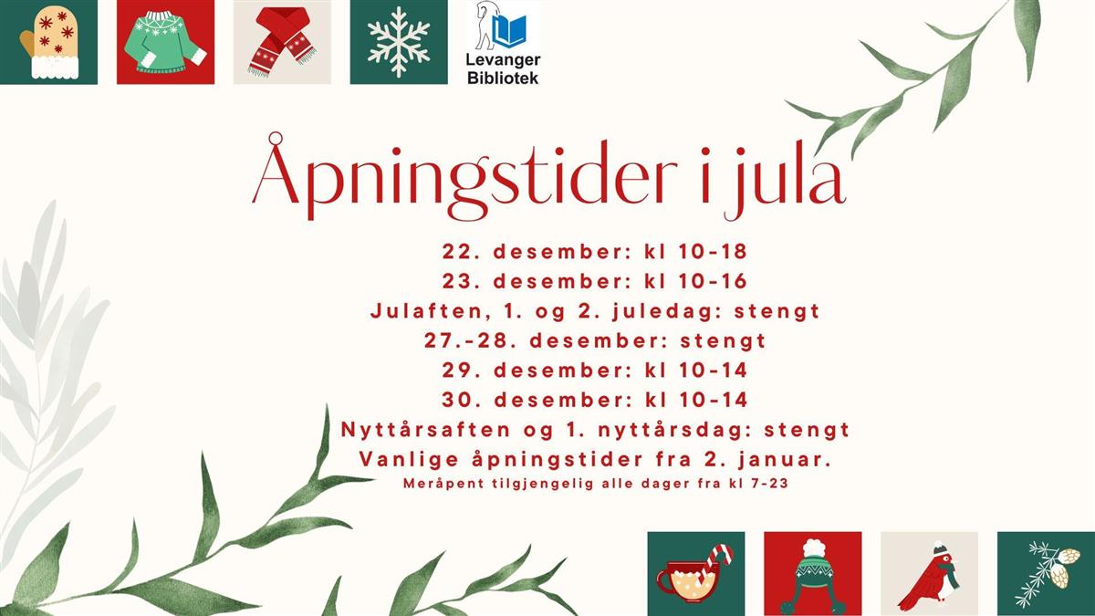 Åpningstider jula 2025Biblioteket har reduserte bemanna åpningstider i jula, men er tilgjengelig med meråpent-avtale. Publisert 10.12.2025 10:57 Sist endret 10.12.2025 10:58