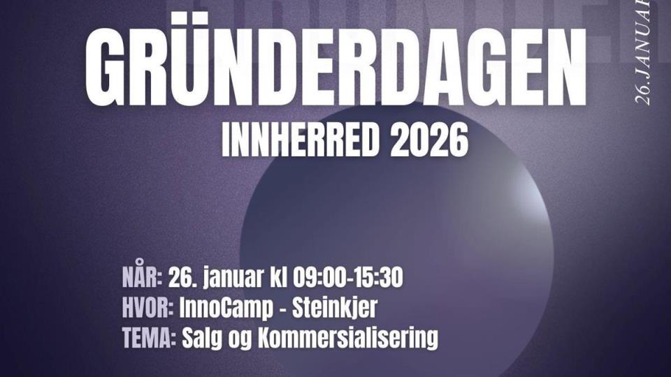 Velkommen til Gründerdagen 2026 Vi gjentar fjorårets suksess og ønsker velkommen til Gründerdagen Innherred på InnoCamp Steinkjer den 26. januar!