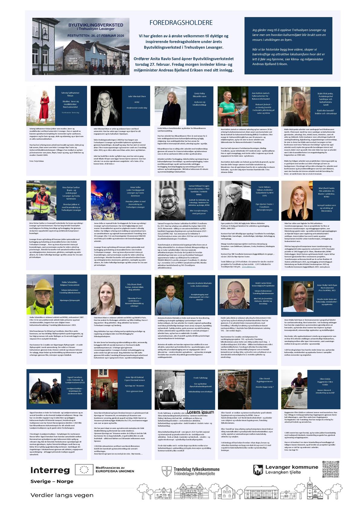Her finner du påmelding, program og oversikt over foredragsholderne: Velkommen til Byutviklingsverksted i Trehusbyen Levanger 2026 - Levanger kommune